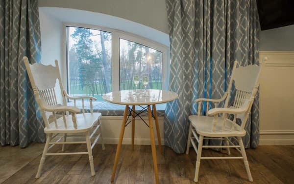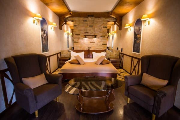 В комплексе обустроено достаточное количество номеров, а его рестораны могут разместить в себе более полсотни человек. Номера отеля от "Стандарт", "Комфорт", "Люкс", "Люкс+", все имеют неординарный интерьер, оснащены качественной мебелью и техникой, персональными банными принадлежностями. Из-за расположения комплекса из окон номеров виден лесной пейзаж, кругом веет прохладой и спокойствием.