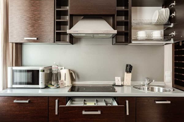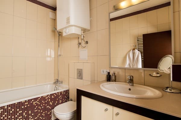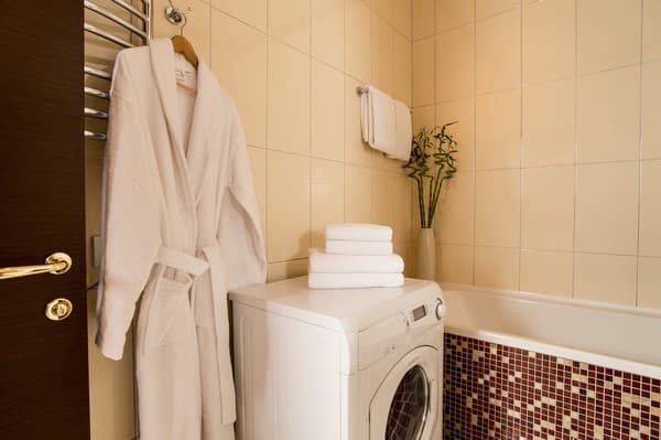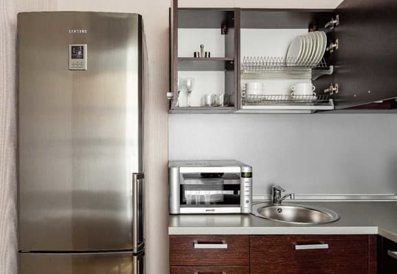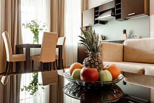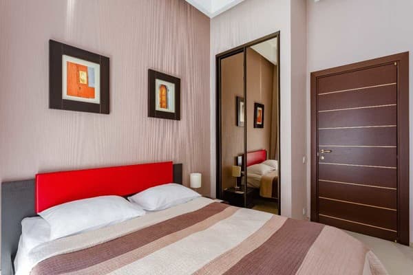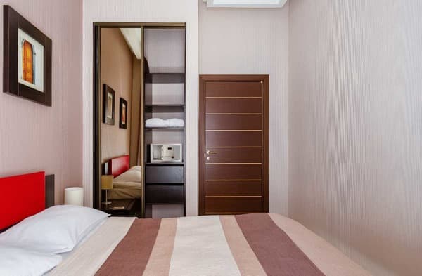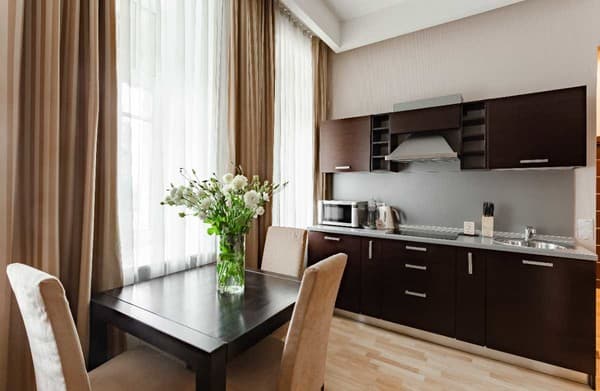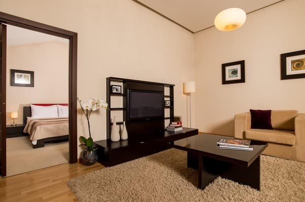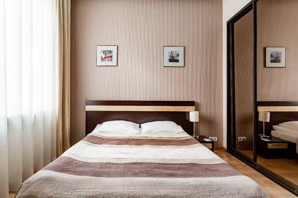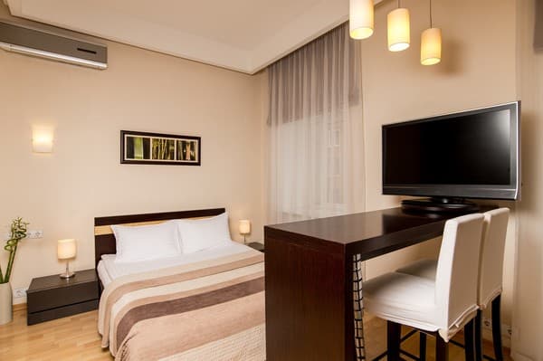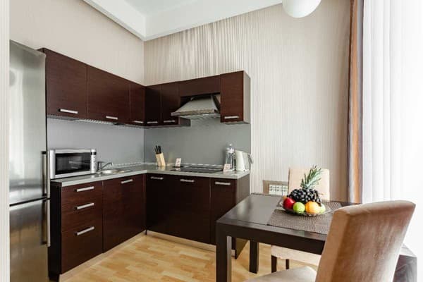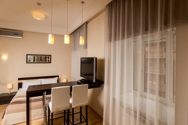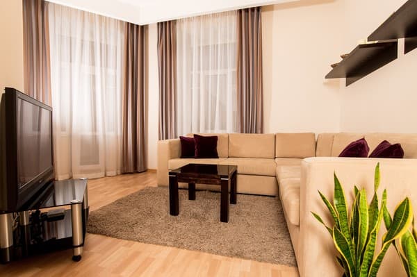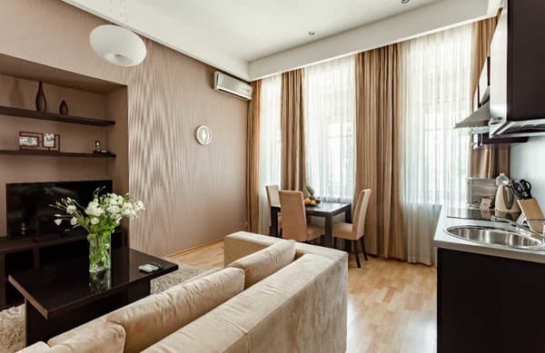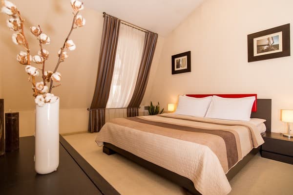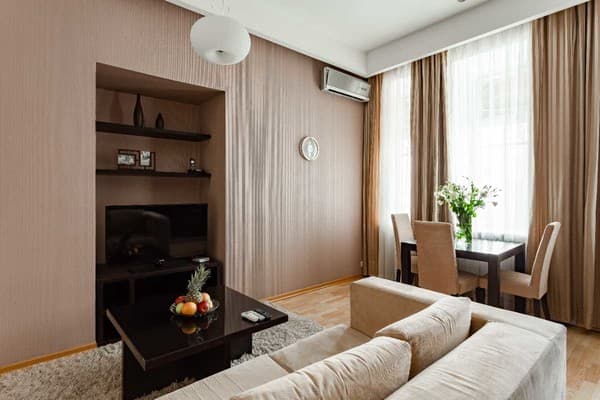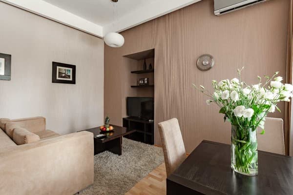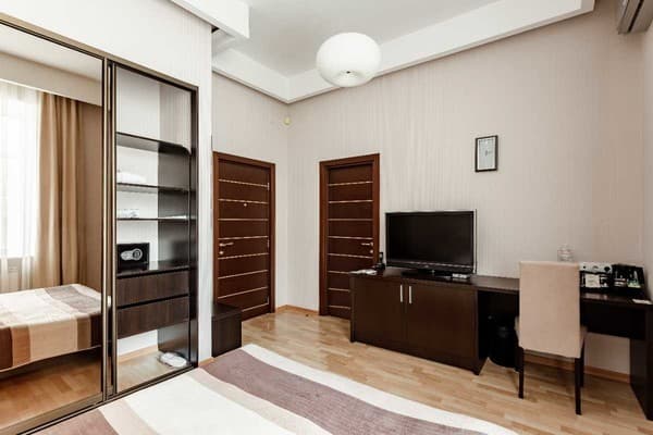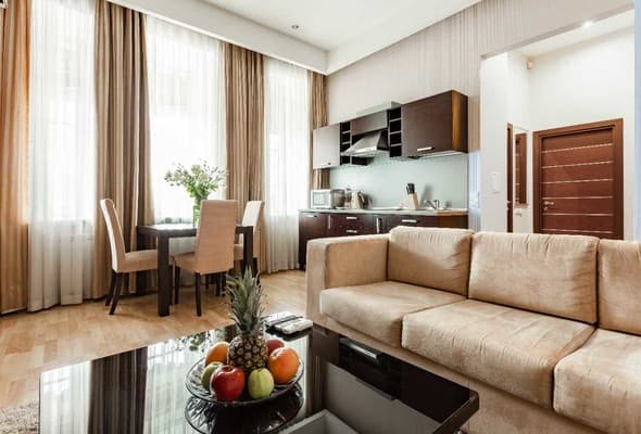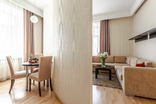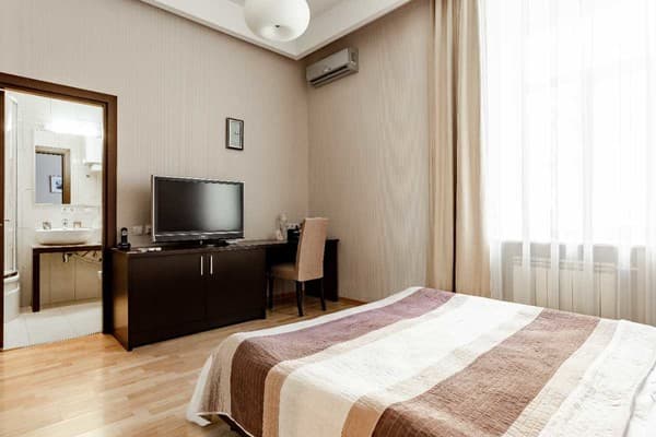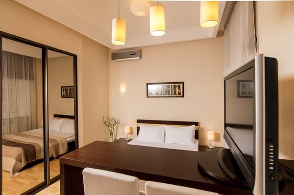 В наличии комнаты различного класса и уровня комфортабельности. Но все они без исключений исполнены в классическом стиле, имеют полное снабжение и новый ремонт. В комнатах высокие потолки и светлые стены, украшенные картинами. В спальных комнатах большие кровати, возле которых есть светильники и прикроватные тумбочки. На кухне – новая мебель и техника, с помощью которой можно готовить еду самостоятельно. В каждом номере есть плазменный телевизор с большим диваном в зале.