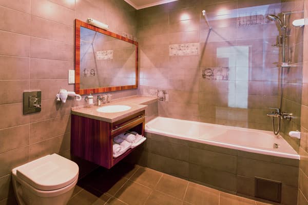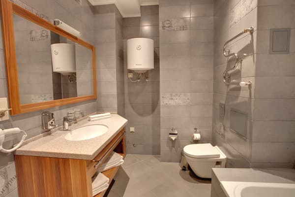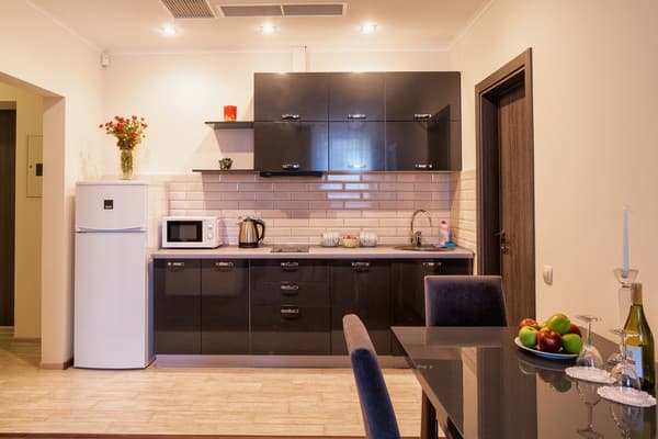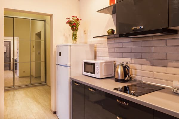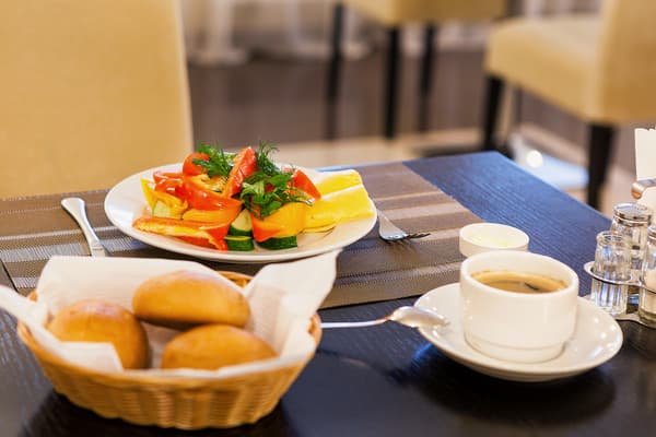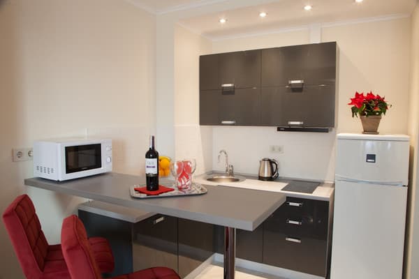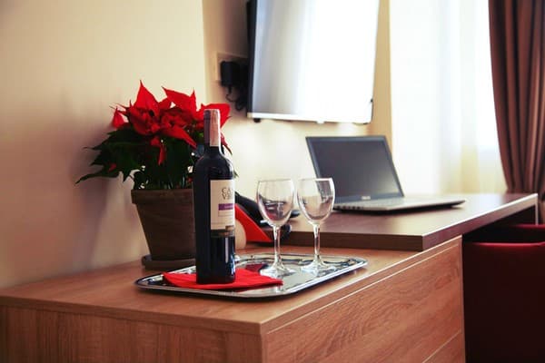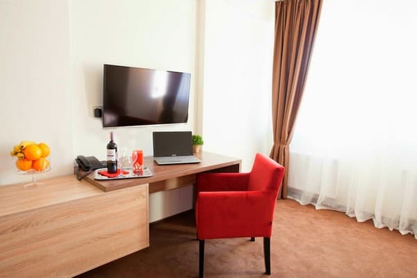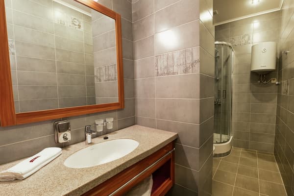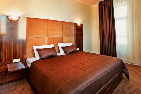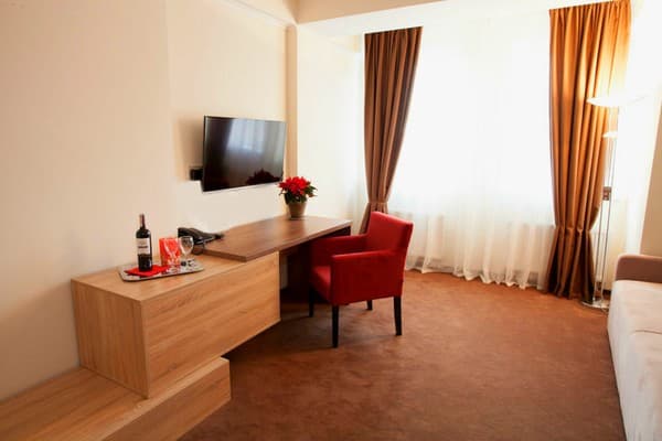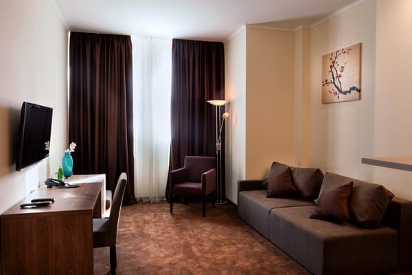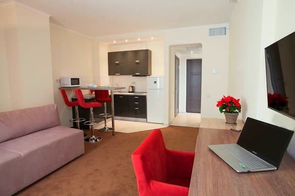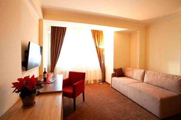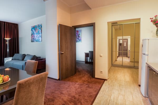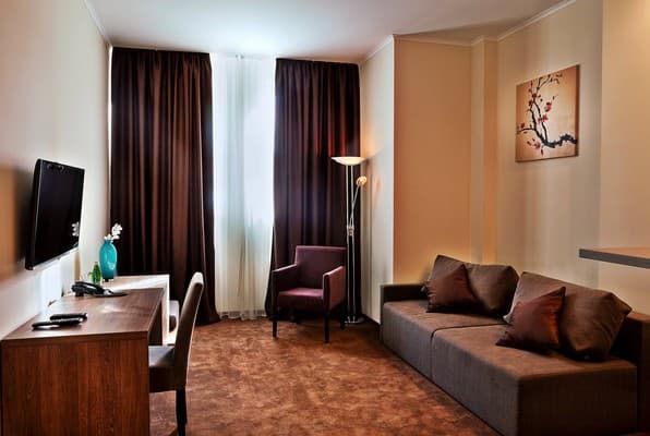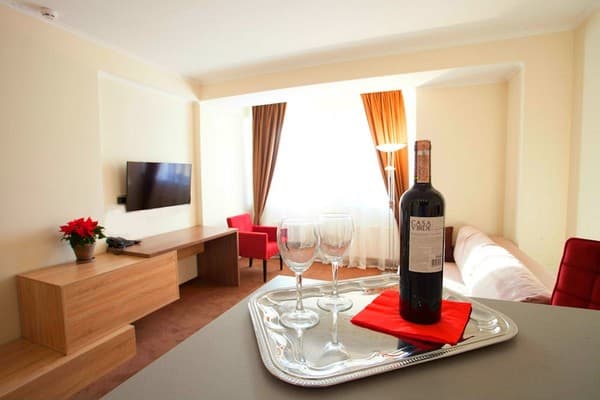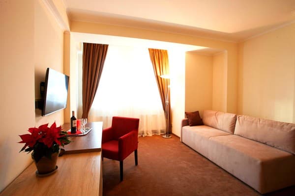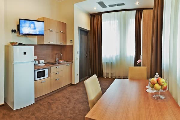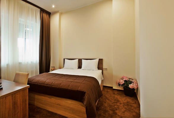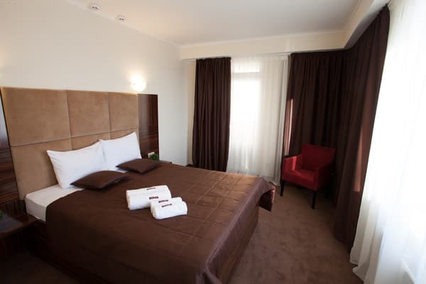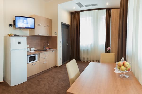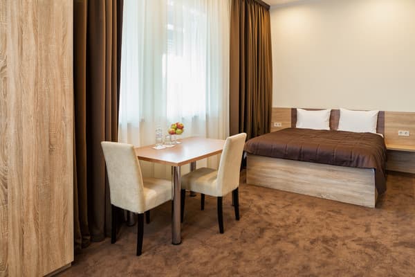 В комнатах новый ремонт и красивый эксклюзивный дизайн. В номерах имеется личный санузел, который вмещает ванную, туалет, большое зеркало и полку для белья и полотенец. Здесь предусмотрена небольшая кухня для самых первых потребностей, например, разогрева еды или приготовления чая. Но полноценный прием пищи туристы могут получить в кафе гостиницы. В меню имеется широкий ассортимент блюд на любой вкус.