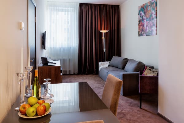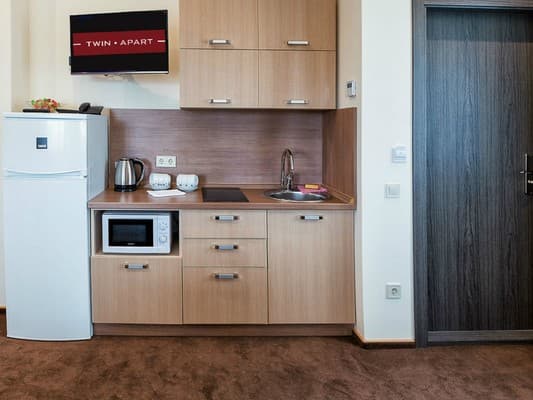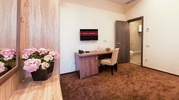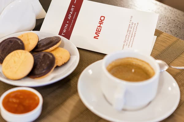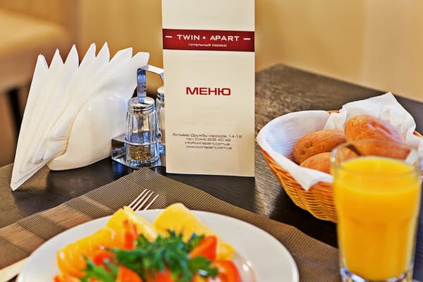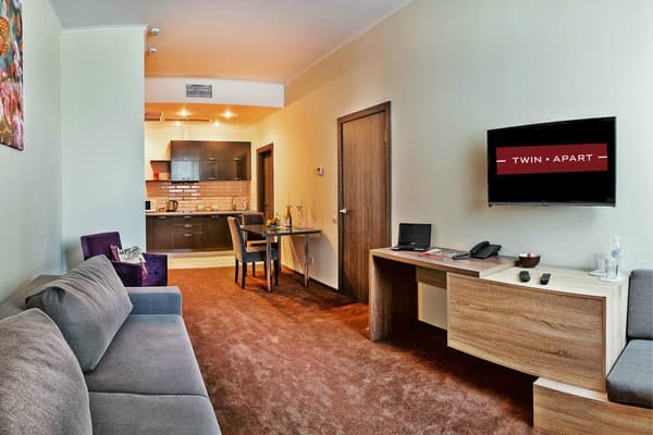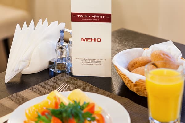 «Twin Apart» - это новый апарт-отель, расположенный в районе Печерска. Внешний вид здания – современный дом с геометрической архитектурой снаружи. Гостей встречают высокие и толстые колоны черного и коричневого цвета. Вход в здание исполнен из чистого стекла, прямо возле него растут маленькие декоративные деревья на клумбе. На второй этаж можно подняться наружной лестницей, которая начинается прямо возле двери в здание. Вечером вся передняя часть подсвечивается. Заходя в апартаменты, гости могут видеть большой зал в бежево-коричневой расцветке, здесь же их встречает администрация и помогает подобрать номер.