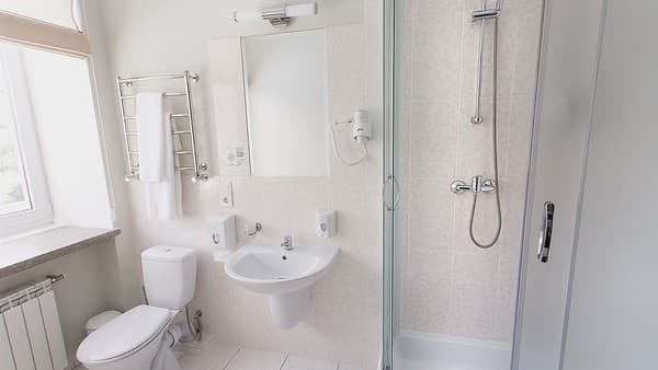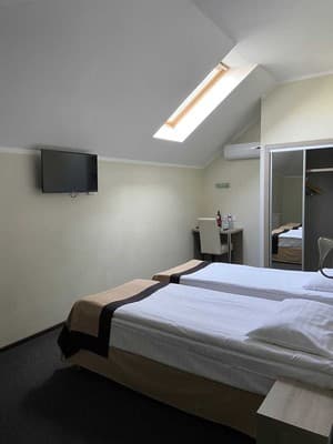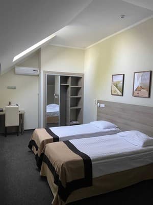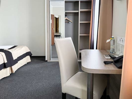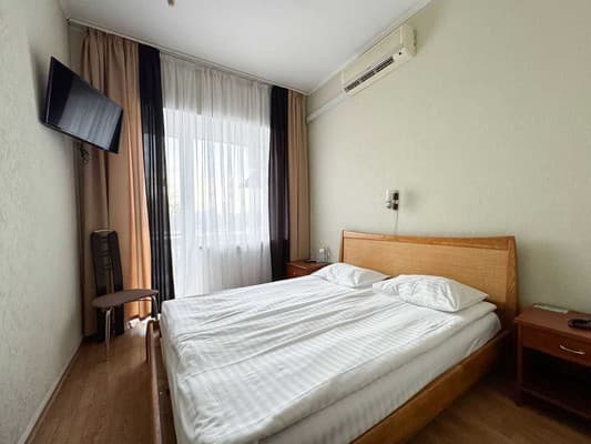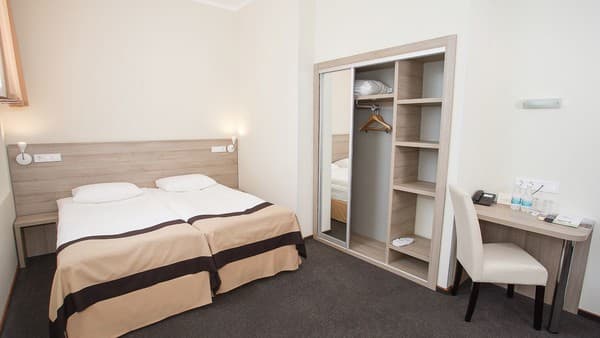 Во всех комнатах установлены спальный гарнитур, представленный одной двуспальной кроватью, просторные шкафы для одежды, системы кондиционирования, телевизоры, небольшие холодильники и санузлы с круглосуточной подачей горячей воды. Из окон отеля открывается красивая панорама на Днепр или зеленую зону парка. В гостинице предусмотрены возможности для комфортабельного отдыха людей с ограниченными возможностями.