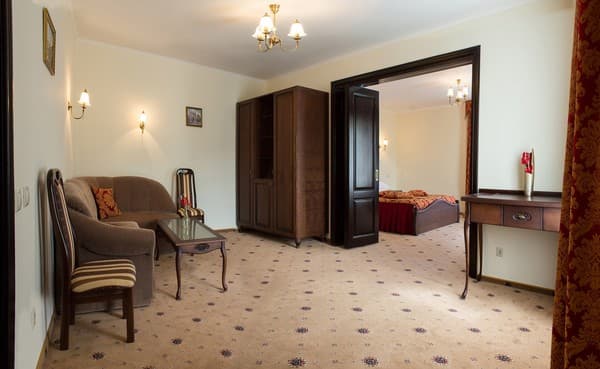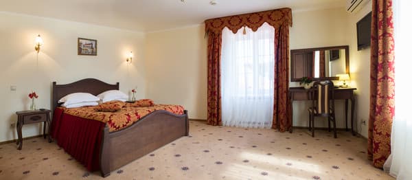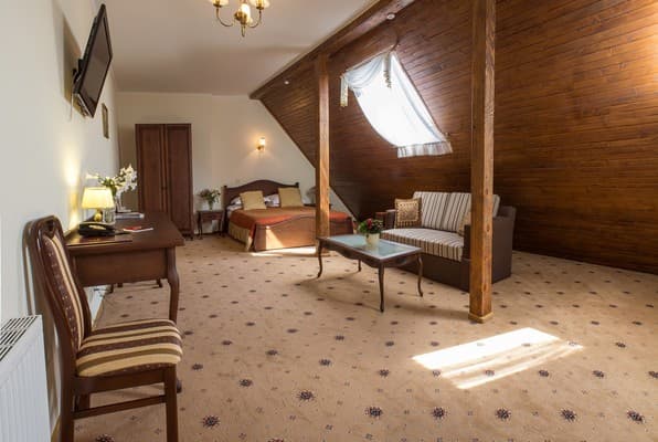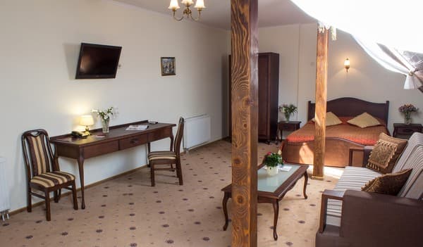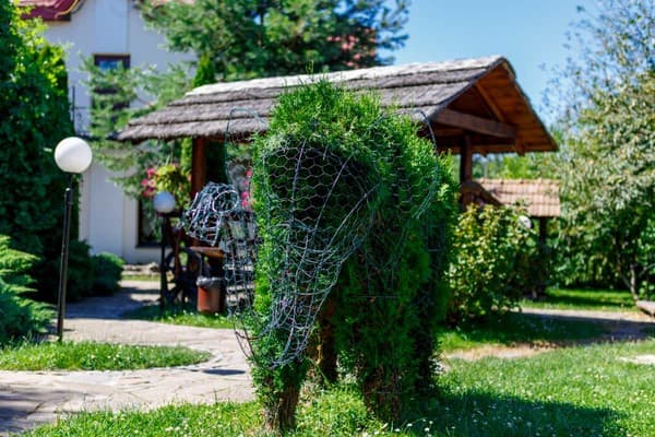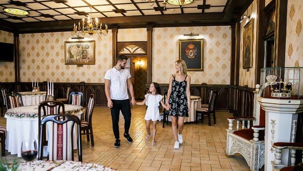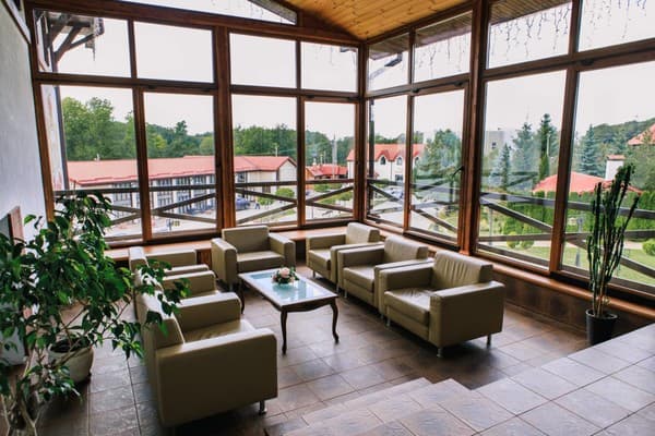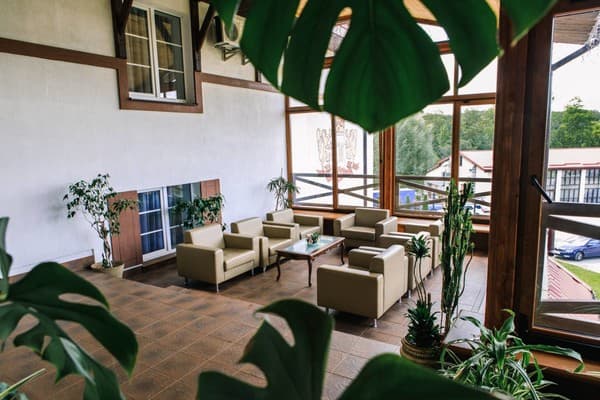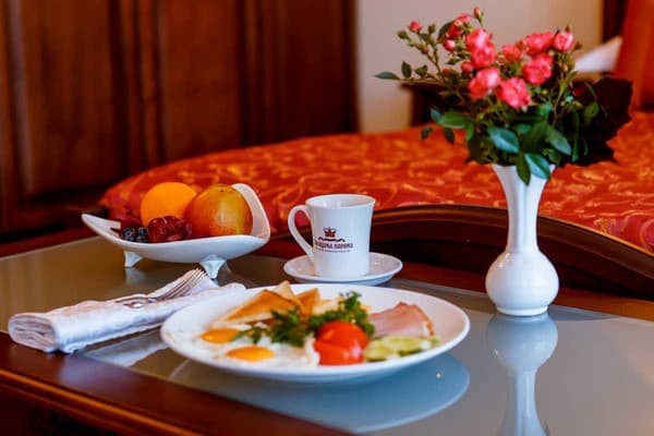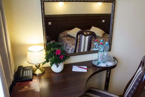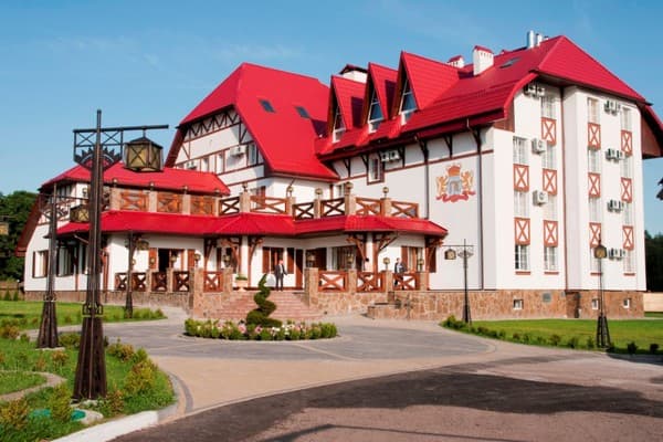 «Галицька корона» – это гостиничный комплекс во Львове в виде четырехэтажного здания с белыми стенами и яркой крышей красного цвета, которую тяжело не заметить из далека. На первом и втором этажах есть террасы со столиками и стульями. Въезд на территорию отеля похож на высокую крепость с камня. Дальше размещена аллея, где можно прогуляться. Тут есть много беседок, небольшой мостик, цветы на подставках, тротуарная плитка по всему двору и огромное количество растений, высокий подстриженный газон. Во дворе есть площадка для игр в баскетбол и волейбол. По запросу можно устроить соревнования по пейнтболу или лазертагу, в этом помогут специальные аниматоры.