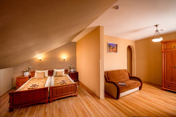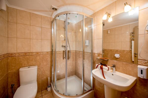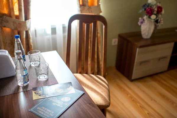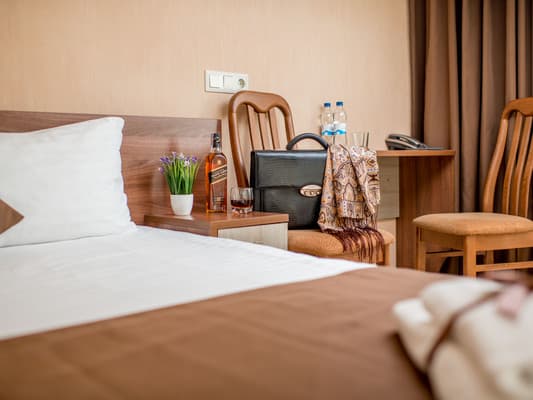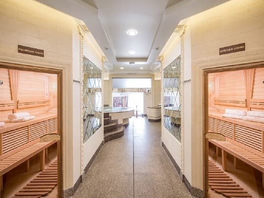 На первом этаже гостей встречает администрация на круглосуточной стойке регистрации. Здесь же стоят диваны, где можно отдохнуть, пока проходит очередь или ищется подходящий номер для клиентов. Комнаты максимально оснащены комфортабельной мебелью и новыми ремонтами в приятных оттенках коричневого цвета. К услугам постояльцев доступна личная ванная комната с базовыми средствами по уходу. Спа-комплекс представлен большим ассортиментом бань, парилок и бассейнов, которые изначально входят в стоимость проживания.