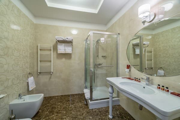Номер “люкс” отличается наличием гостиной с раскладным мягким уголком и дополнительным санузлом.