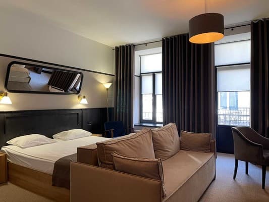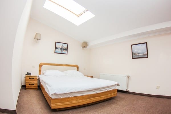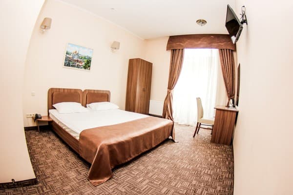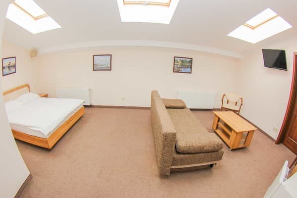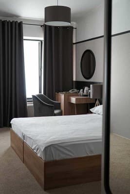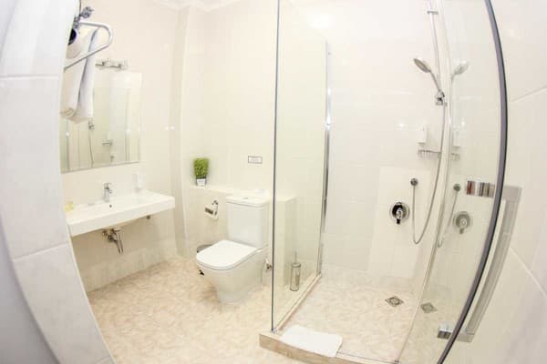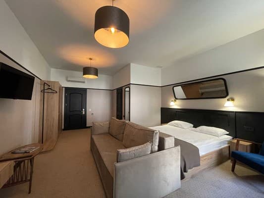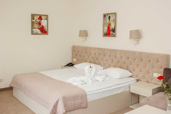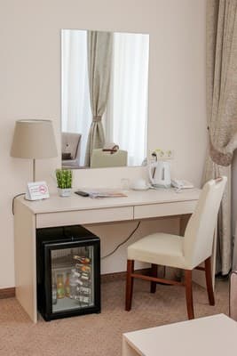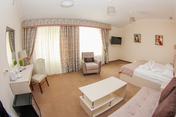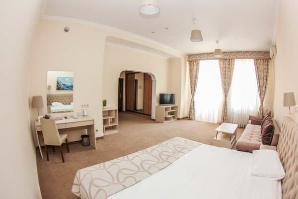 Номера высшей категории имеют большую площадь, рабочую зону, мини-кухню в гостиной, а также в просторной ванной с окном - ванную.