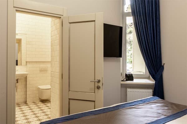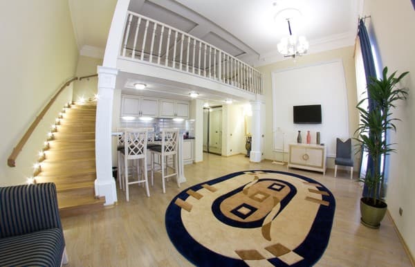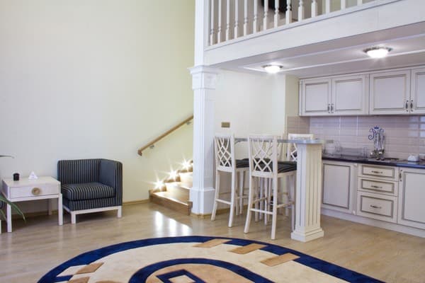 Номера класса «Апартаменты» просторные, в них есть кухня с микроволновкой и чайником, а также стол и уголок для гостей. «Люкс» состоит из двух уровней. На первом расположена кухня, барная стойка и кресла, на втором спальня.