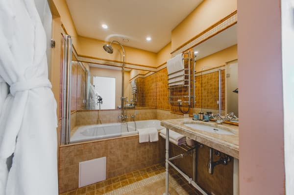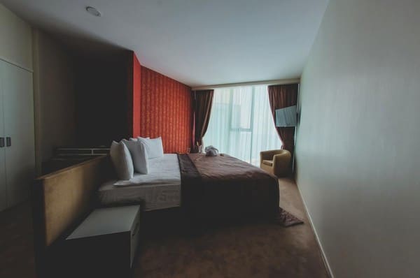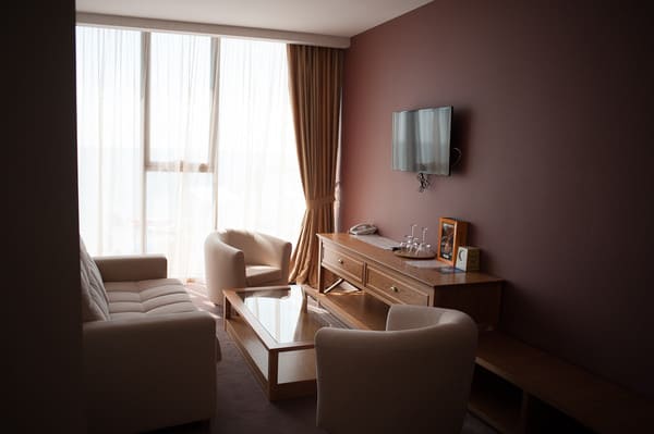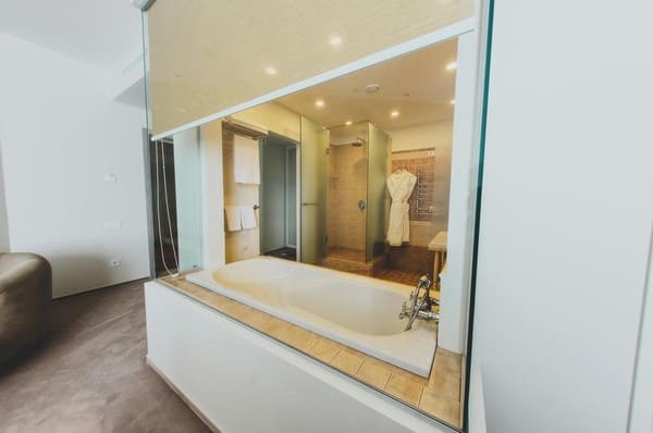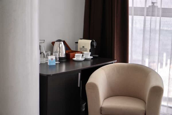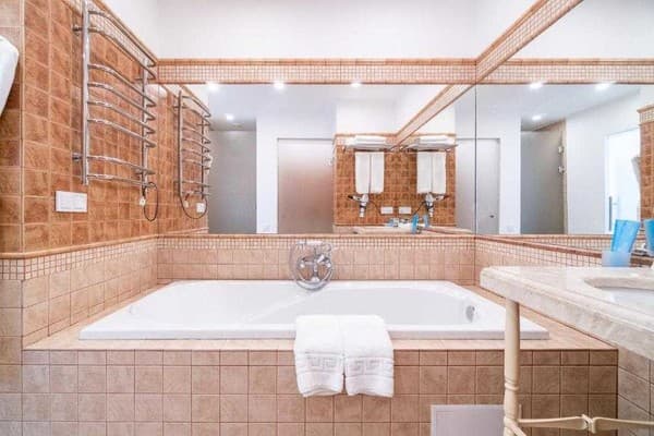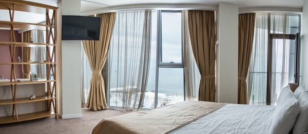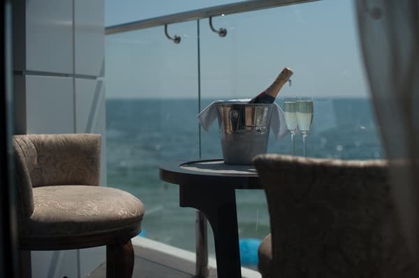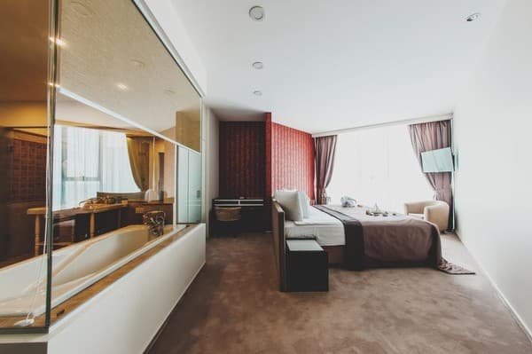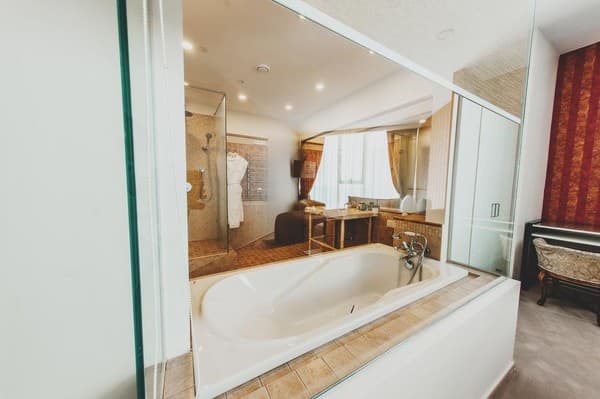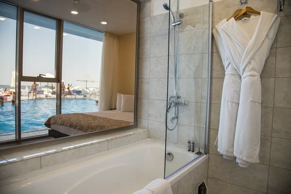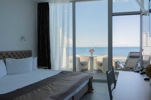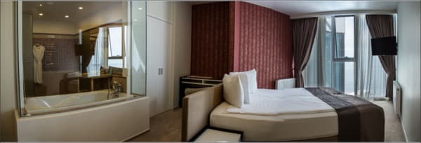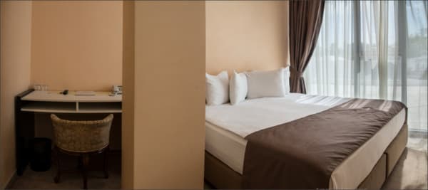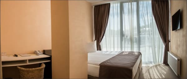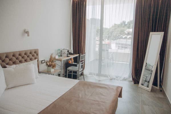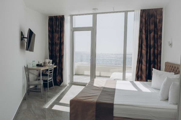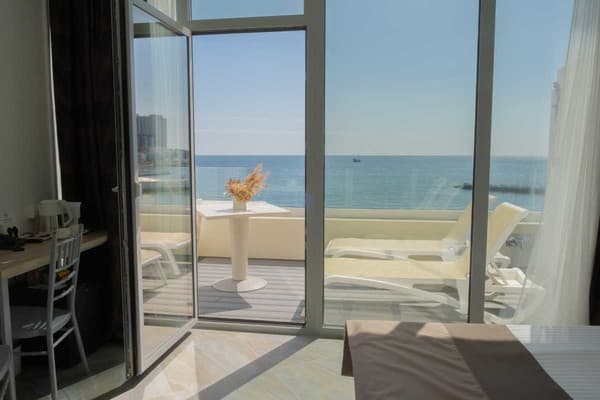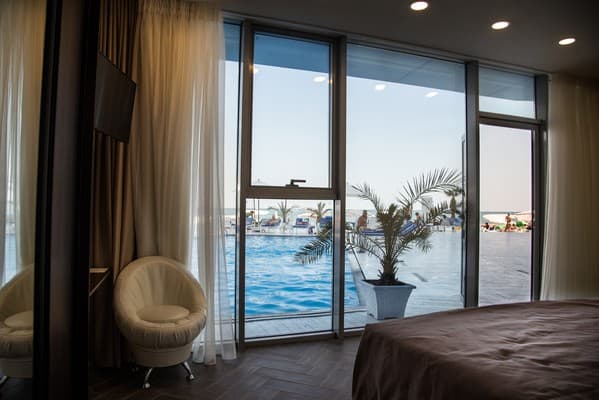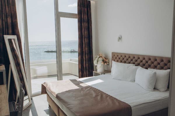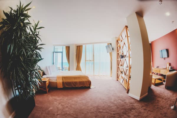 Номера “люкс” имеют просторную гостиную с мягким уголком, кофемашиной, открытой террасой с мебелью и шикарную ванную комнату с джакузи и биде. При поселении в номер гостям предоставляются фрукты и шампанское. Есть также номер с сауной.