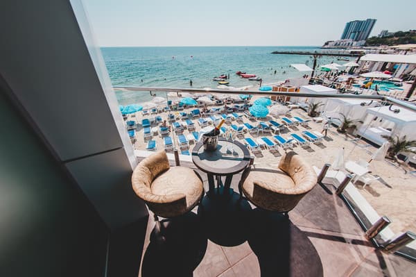 На пляже “Аркадия” в Одессе находится отель “Portofino Beach Resort”. Отель состоит из 11 номеров от стандартных до “люкса”, рассчитанные на проживание от двух до 4-х гостей. Во всех номерах установлена система кондиционирования, спутниковые каналы, телефон, мини-бар, сейф. Роскошные ванные комнаты оснащены банными, туалетными наборами и мини-косметикой. Во всех номерах есть балконы с видом на море или на бассейн, а также панорамное остекление.
