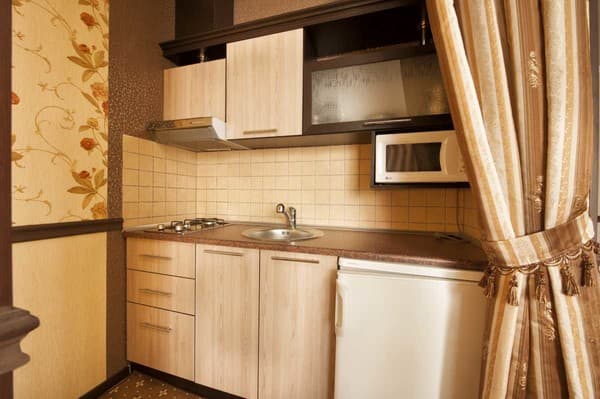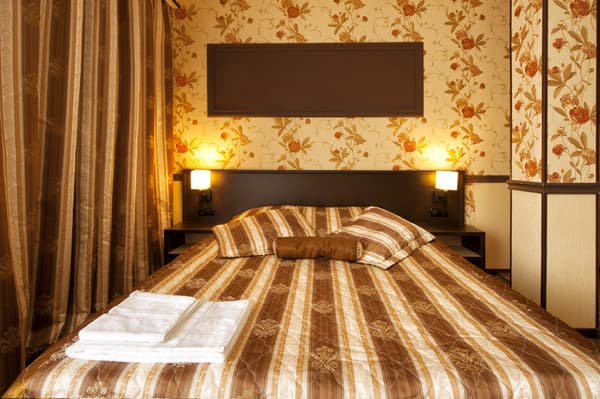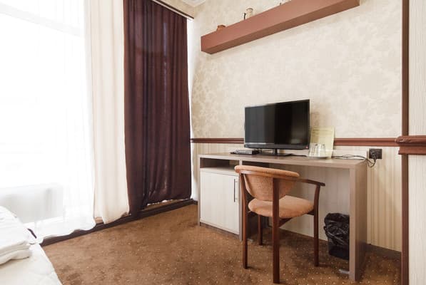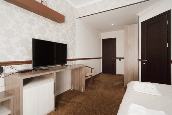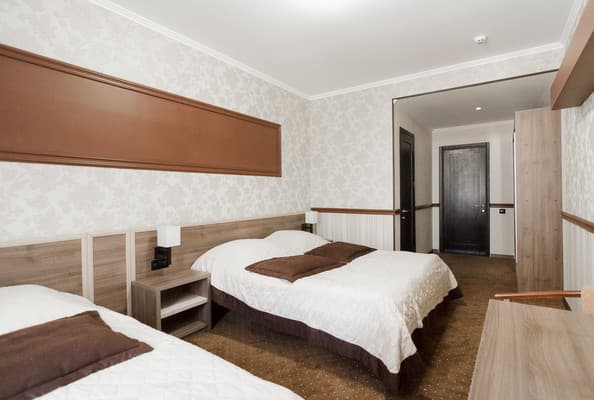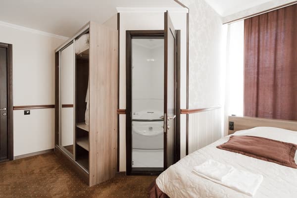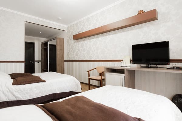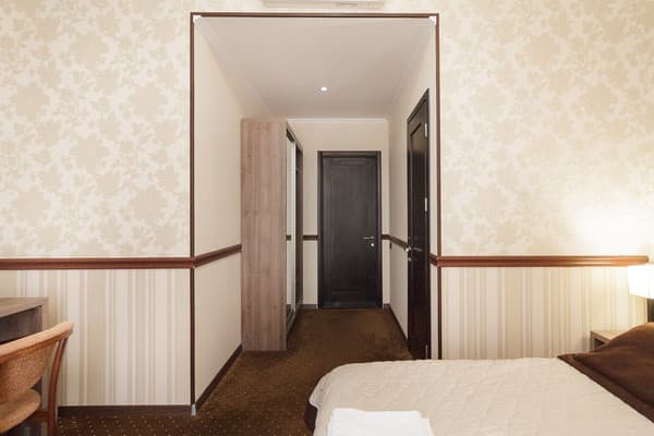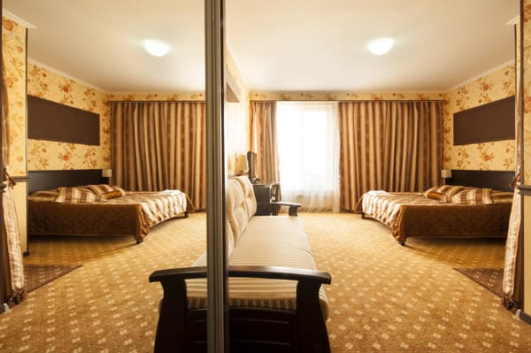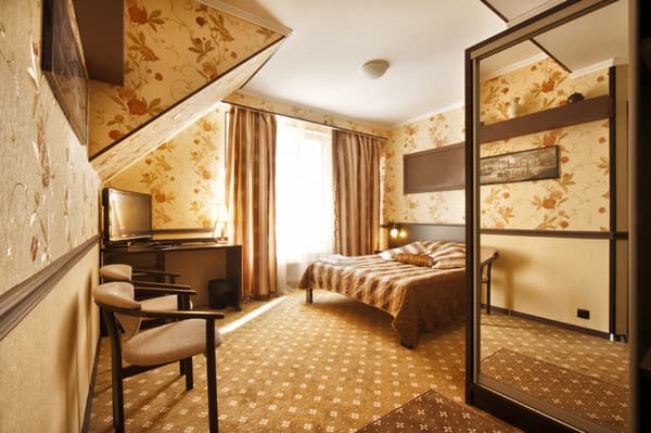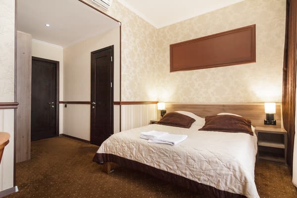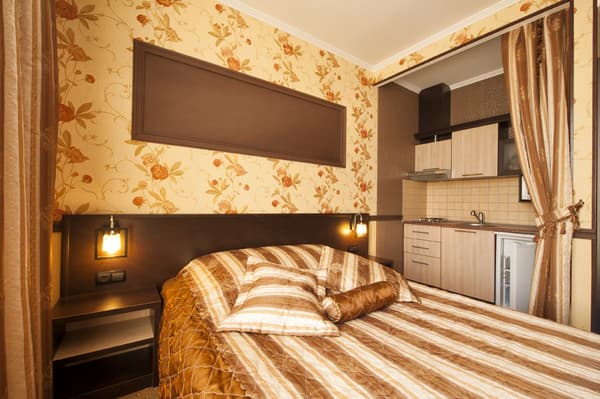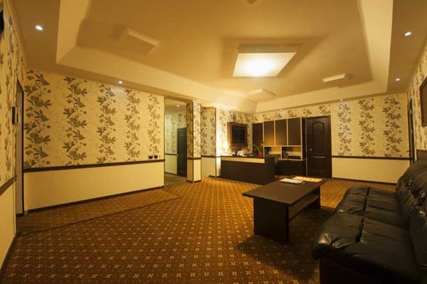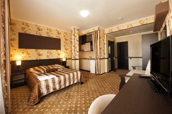 В огромном номере “люкс” добавлена гостиная с мягкой мебелью и зоной столовой, полноценная кухня с кухонной и бытовой техникой, а также дополнительный санузел.