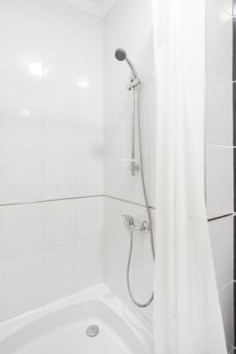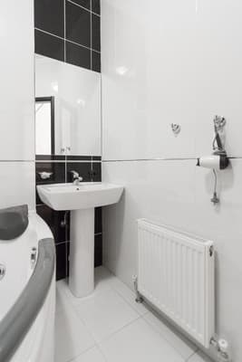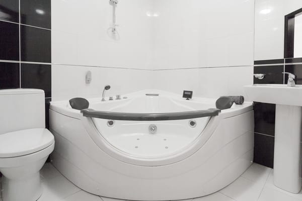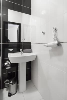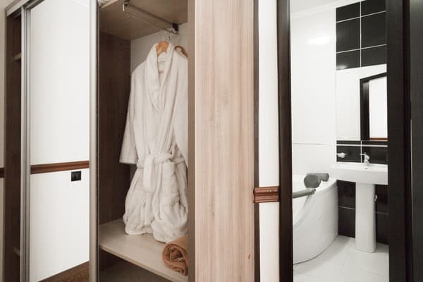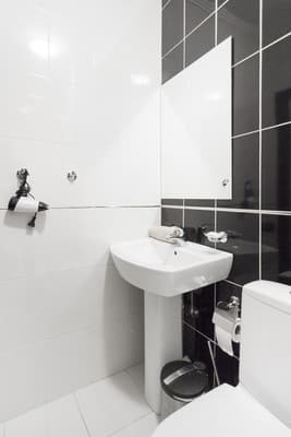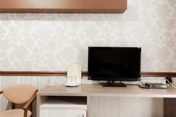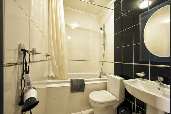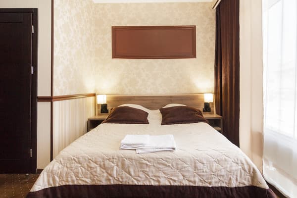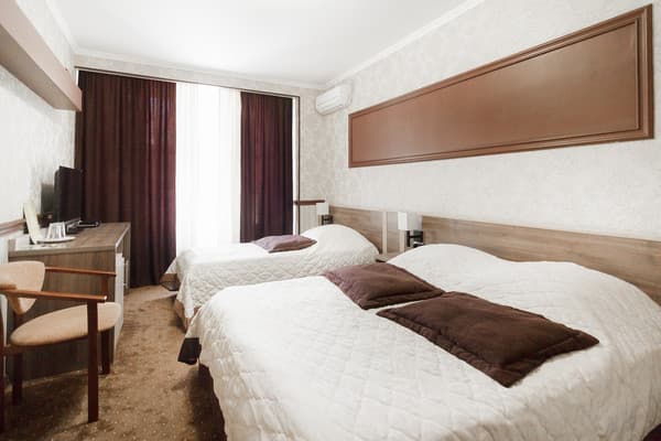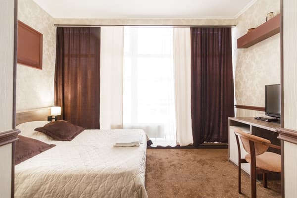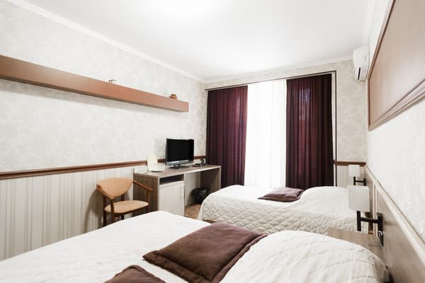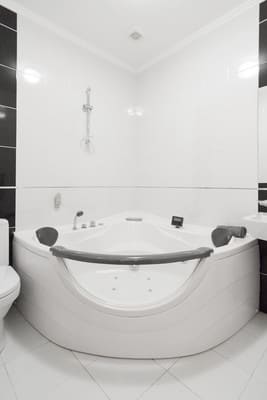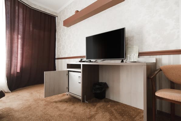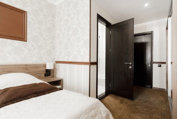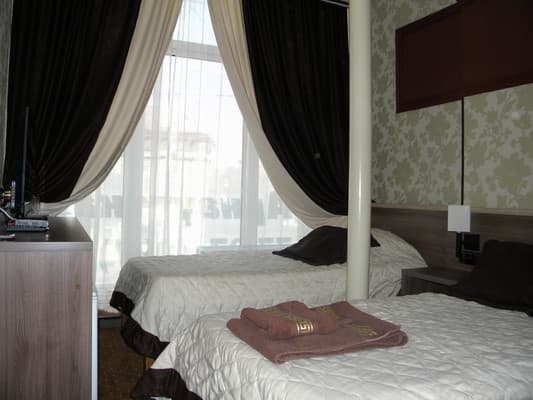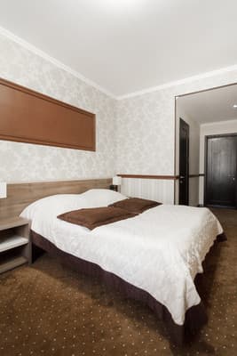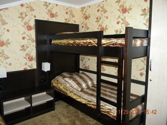 В огромном номере “люкс” добавлена гостиная с мягкой мебелью и зоной столовой, полноценная кухня с кухонной и бытовой техникой, а также дополнительный санузел.