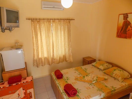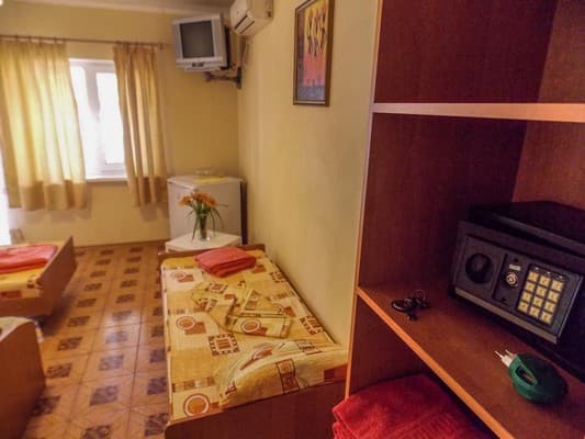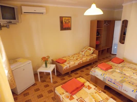 Пансионат новой постройки, поэтому во всех номерах сделан ремонт. Комнаты обставлены современной мебелью: комфортабельными кроватями, шкафом, столами. Из технических приспособлений установлены: холодильник, кондиционер, телевизор с кабельным ТВ. Присутствует бесплатное подключение к сети WI-FI. В номерах есть отдельный санузел и душ. Горячая вода подается круглосуточно. Производится ежедневная уборка. Размещаются дети всех возрастов, но без предоставления дополнительного места.